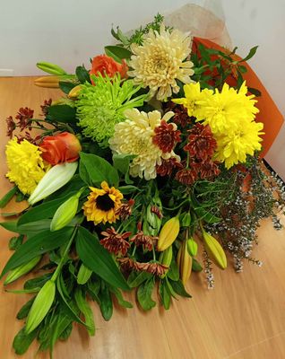 A stunning, vibrant bouquet in bright colours using seasonal blooms and fresh foliage will be created by one of our talented florists. One of our Most popular Bouquets. Send this beautiful flower bouquet for any special occasion; birthday, anniversary, thank you, condolence or a get well soon.Different sized bouquets are available, and you can choose from a wrapped bouquet, a water-filled box, or a vase.