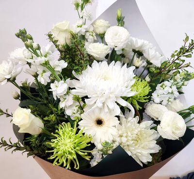 A Seasonal Selection of the freshest Whites and Greens to create a classic modern Bouquet for any occasion. Different sized bouquets are available, and you can choose from a wrapped bouquet, a water-filled box, or a vase.