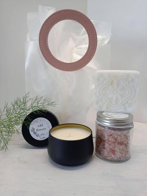 A Beautifully Presented range of Petite Candles, Goats Milk Soaps and Himalayan Bath Salts.