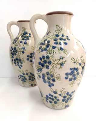 A delightful stoneware jug embellished with a vintage blue and white floral pattern evokes a sense of nostalgia and pastoral charm. While not a suitable water pitcher, this jug is highly decorative and can be used as a vase for flowers.