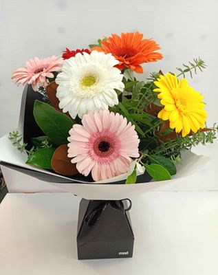 Our Collection of 6 Large Gerberas either pastel or bright will look Stunning gracing anyone's table. A superb pop of Colour to brighten someone's day. Comes arranged with foliage in a Water filled box.